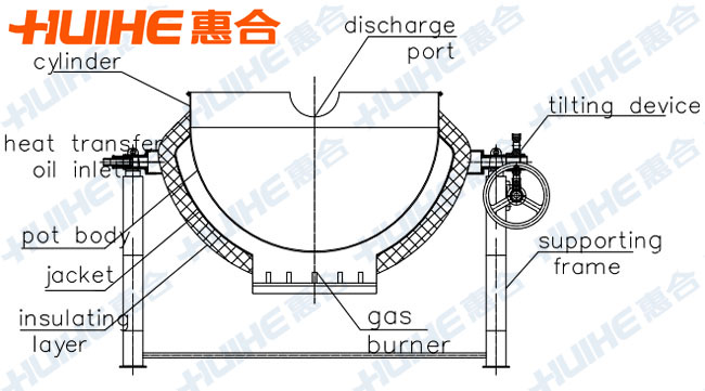 Tilting Jacketed Kettle is mainly composed of pot and tilting frame; and the pot is the double layer structure formed by inside and outside spherical pot; middle layer can add heat-conducting oil or water.