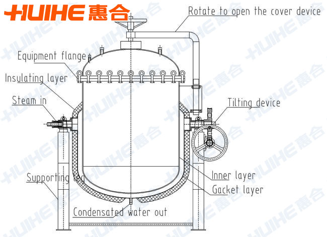 1、Cooking pot belongs to stainless steel tank and takes a certain pressure steam as heat source (also can choose electrical heating), owns characteristics such as large heating area, high thermal efficiency, uniform heating, short liquid material boiling time and easy to control the heating temperature.
