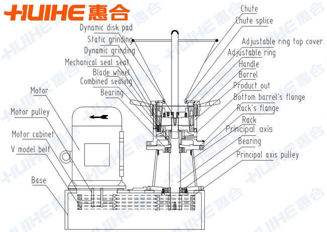 2、Split colloid mill also called horizontal colloid mill, production is more complex than vertical colloid mill, design should consider when in the production of the colloid mill axial positioning, it’s in case the motor shaft axial dynamic touch tooth wear, preferably before the motor end cover bearing, because the design of the motor rotor and shaft axial thermal expansion in motor front bearing key to rear bearing direction, to reduce the influence on grinding head clearance.