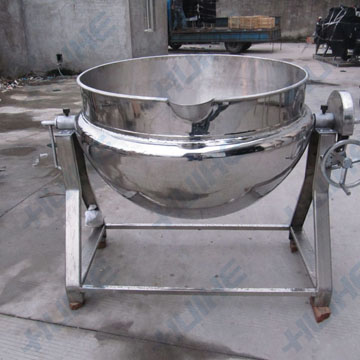 燃?xì)鈯A層鍋:就是人工打開氣閥,點(diǎn)燃燃?xì)猓尤胧秤糜停蜏剡_(dá)到烹飪溫度時(shí),加入適量的物料,人工翻鍋、攪拌,使物料在鍋里均勻受熱。待物料加工完畢后,關(guān)氣熄火,轉(zhuǎn)動(dòng)手柄,通過(guò)蝸輪、蝸桿傳動(dòng)裝置,使鍋體旋轉(zhuǎn)傾斜,將物料倒入另一容器內(nèi)。