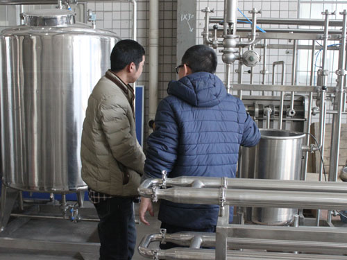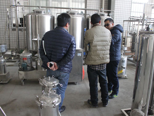 2015年3月2日,河南客戶自主創(chuàng)業(yè)需要采購一套豆?jié){生產線設備,來我公司考察并與業(yè)務員進行具體需求的洽談。下圖為業(yè)務員向客戶講解工廠設備: