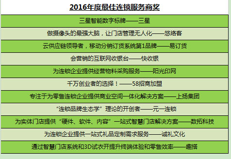 本次峰會(huì)現(xiàn)場(chǎng)的頒獎(jiǎng)環(huán)節(jié)更為引人矚目。以名創(chuàng)優(yōu)品、西貝、漢堡王、海底撈、百果園等為代表的全國,乃至全球的知名品牌商榮登“2016年度中國高成長連鎖50強(qiáng)”榜單;“2016年度更具潛力連鎖之星”則分別被望湘園、永和豆?jié){、新加坡媽媽烤包、喜來快遞、大腦地圖等優(yōu)質(zhì)連鎖企業(yè)奪得;開心麗果、漢堡王、名創(chuàng)優(yōu)品、麥多、皇家雞排等則獲得“2016年十大更值得加盟連鎖品牌”;而“2016年十大更受消費(fèi)者喜愛門店”則“花落”鯊魚先生博物館、木屋燒烤、cityzoo、popmart、精悅?cè)嘏M艿壬碳?好享家、新發(fā)則、凱蘭帝等為代表的連鎖行業(yè)“新勢(shì)力”毫無疑問地拿到了“2016年度商業(yè)模式創(chuàng)新獎(jiǎng)”。