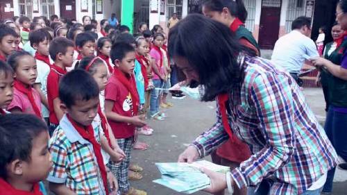 早晨7點(diǎn)鐘,愛心隊(duì)伍從南寧地王大廈出發(fā),途中路況極差,塵土飛舞。車隊(duì)歷經(jīng)九個(gè)小時(shí)到達(dá)泮水鄉(xiāng)村冊(cè)外小學(xué)。愛心團(tuán)隊(duì)的到來,頓時(shí)令這個(gè)校園學(xué)生歡騰熱鬧起來,學(xué)生排好整齊的隊(duì)伍歡迎著愛心隊(duì)伍的到來。學(xué)生代表們給到場(chǎng)的每一位愛心人士戴上了感恩紅巾。