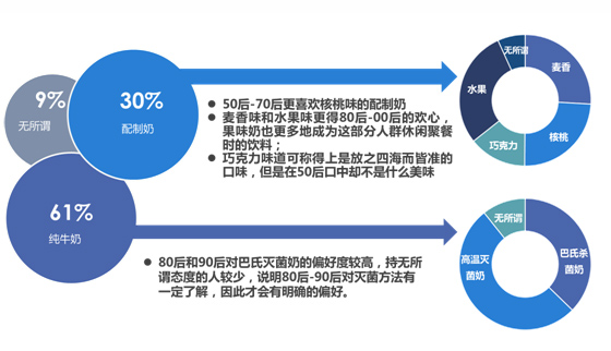 綜合年齡和區(qū)域分析發(fā)現(xiàn),中老年消費(fèi)者和70后消費(fèi)者的需求區(qū)域主要集中于西部地區(qū)的中小城市;而對(duì)于80、90和00后的消費(fèi)者,需求區(qū)域已經(jīng)開始向東部地區(qū)的一、二線城市轉(zhuǎn)移,液態(tài)奶廠商需要隨時(shí)關(guān)注市場需求的動(dòng)向來決定未來營銷、鋪貨的策略等。