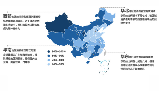 從地區(qū)上看,華北地區(qū)(除北京和天津兩個(gè)直轄市外)整體比例較低,西部地區(qū)比例很高,另外長江流域省份也相對(duì)較高。一線城市消費(fèi)者對(duì)于液態(tài)奶健康方面的需求相對(duì)更加看重;二、三線城市以及其他中小城市則更加關(guān)注液態(tài)奶的味道、美容減肥效果、滿足小孩喜好等,且更易受身邊朋友的影響。
