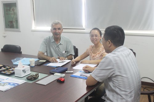 迪拜客戶需要定制數(shù)臺攪拌罐,來我公司參觀并與銷售人員進行具體細節(jié)的洽談。